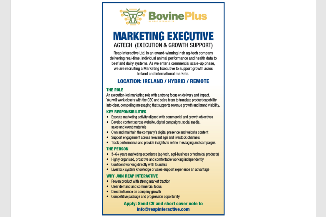 Reap Interactive Ltd. is an award-winning Irish ag-tech company delivering real-time animal performance and health data to beef and dairy farms. As the business scales commercially, we are hiring a Marketing Executive to deliver execution-led marketing that directly supports sales and growth. Working closely with the CEO and sales team, you will translate product capability into clear market messaging, manage digital and content activity, and drive brand visibility across agri and livestock channels. This role suits a proactive marketer with 3–6+ years experience in ag-tech, agri-business or technical products, who is highly organised, commercially aware and comfortable working independently. Ireland-based, hybrid or remote. Competitive package and growth opportunity. To Apply: Send CV and a short cover note to info@reapinteractive.com - Check out our company at bovineplus.com