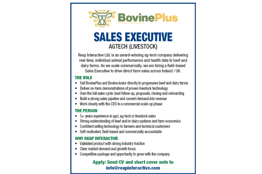 Reap Interactive Ltd. is a scaling ag-tech company delivering real-time animal performance and health data to beef and dairy farms. We are hiring a field-based Sales Executive to drive direct sales across Ireland / UK.