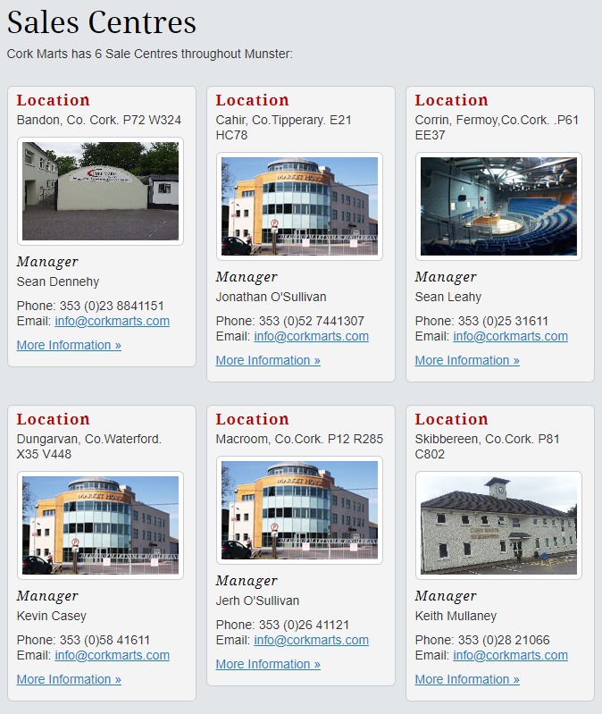 Cork Co-operative Marts Limited was established in 1956. It is Ireland's largest Livestock Auctioneers. Cork Marts is a farmer owned Co-operative, with 11,000 shareholders. We sell 190,000 Cattle and Calves, and 70,000 Sheep annually. We also provide a service for Live Exports, as well as a buying service for our customers. Chief Executive: Sean O'Sullivan, Finance Manager: Jerry Moynihan